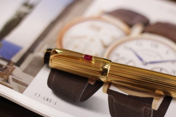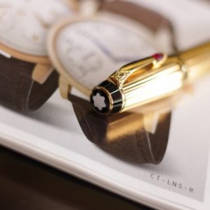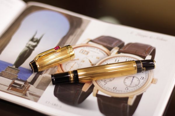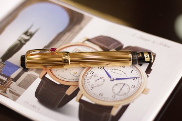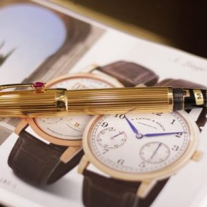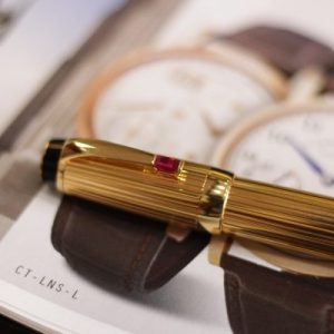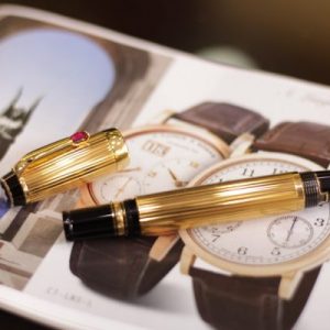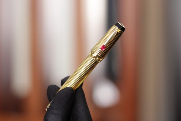 Là bản cao cấp của dòng Bohème với thân kim loại mạ vàng toàn thân họa tiết kẻ sọc Pinstripe, cây bút này được đính đá màu đỏ (Ruby Red – Rouge), ngòi vàng 18K-750 bicolor cỡ M (Medium).